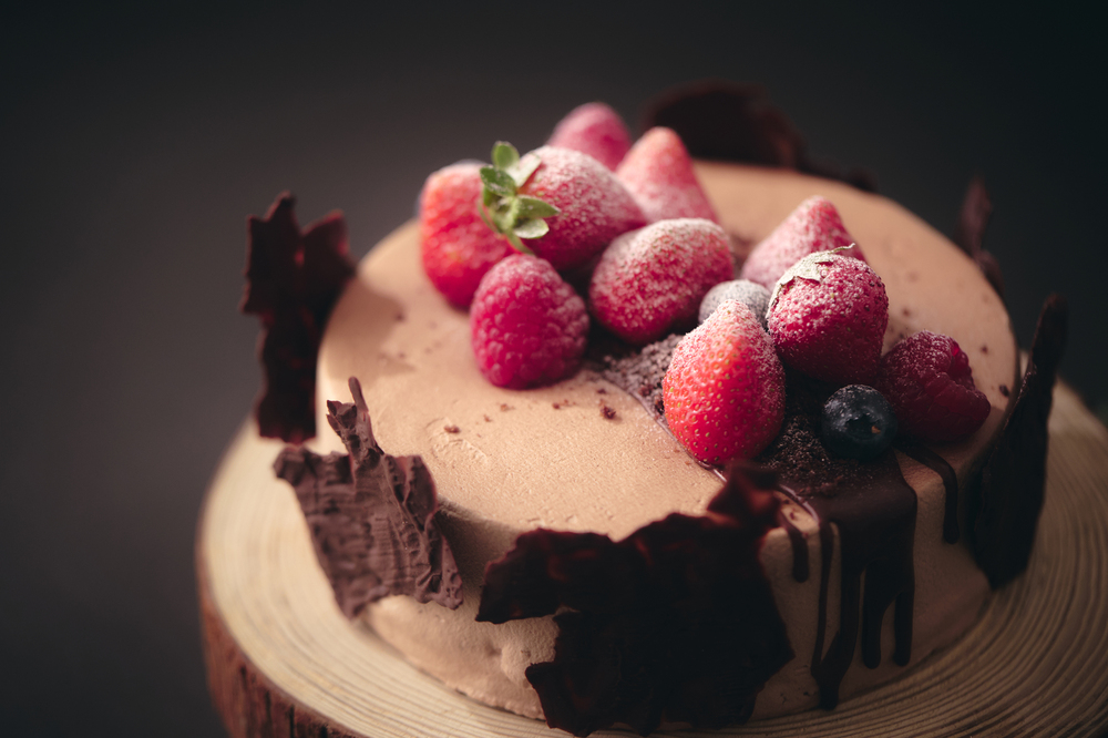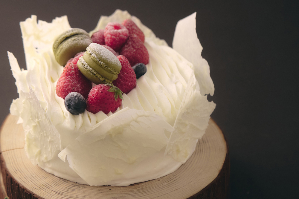 ジェノワーズにシロップをしみ込ませ、しっとりと口溶けよく仕上げました。クレームパティシエールを丁寧に塗り、練乳風味のクリームと甘酸っぱい苺を贅沢に使用。仕上げにベリーとピスタチオマカロンをあしらい、華やかでクリスマスにふさわしいケーキです。