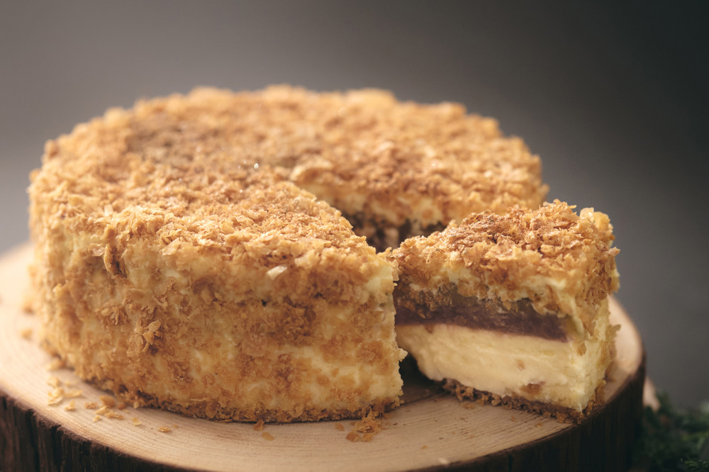 濃厚なベイクドチーズケーキに、爽やかなライム香るレアチーズを重ねた贅沢な二層仕立て。 中にはリュバーブのコンポートをそっと忍ばせ、口に広がる酸味とチーズのコクが絶妙に調和します。 仕上げに香ばしいフイユタージュのクラムを纏わせ、食感と風味にアクセントを加えた、クリスマスの特別なひとときを彩る上品なチーズケーキです。