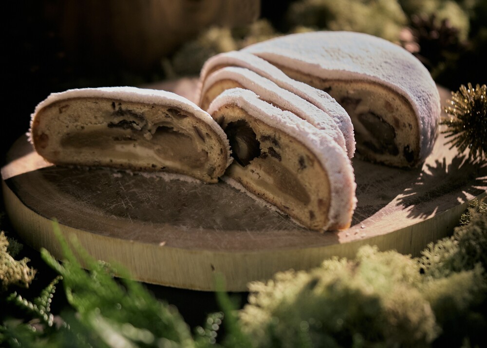 香ばしいブリオッシュ生地に、焼きリンゴ、プラムのアルマニャック漬け、レモンコンフィ入りマジパン、フランス産シャテーニュを贅沢に包み込みました。 焼成後は三度に分けて溶かしバターに浸し、バニラシュガーで優しくコーティング。しっとりとした生地に素材の豊かな風味が重なり合う、クリスマスだけの特別な味わいです。